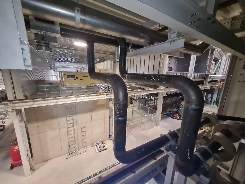 Für den Neubau einer Halle des Hauptauftraggebers GTS, einem Unternehmen für Umwelttechnik und Energiesysteme, haben wir in Zusammenarbeit mit der Planungsfirma IPCS in Ibbenbühren eine neue Thermalölleitung verlegt. Hierbei handelt es sich um eine 150er-Stahlleitung als Verbindung vom Heizkessel zum Trockner, in dem lackierte Teile von Nutzfahrzeugen getrocknet werden. Dafür muss das Öl auf 300 °C erhitzt werden. Zum Teil wurden die Leitungen und Halterungen auf dem Antrok Maintenance Campus in Lohfelden vorgefertigt.