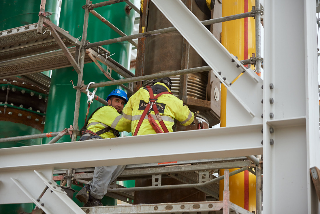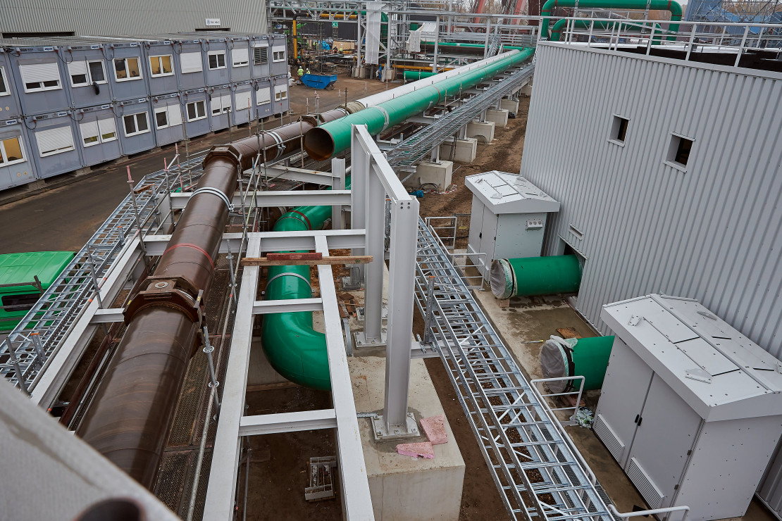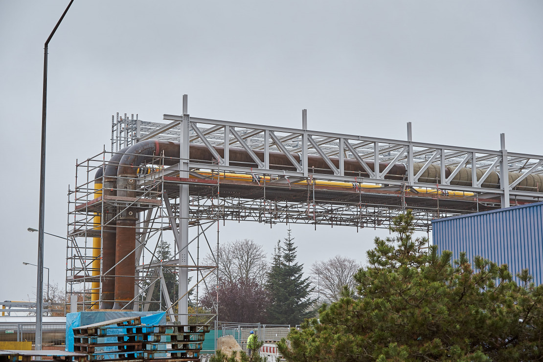 Die Kühlwasserleitung wurde jeweils für eine von 2 Gasturbinen vom Pumpenhaus über das Kraftwerk bis zum Kühlturm verlegt. Die größten Herausforderungen hierbei waren eine Rohrbrücke direkt unter der 110 KV Leitung sowie der Rohrbrückenabschnitt über dem neuen Gas-Haus. Hier mussten 100 m Rohrbrücke in 3 Teilabschnitten komplett mit Rohren bestückt eingehoben werden. Allein unsere Rohre hatten in der unteren von 2 Etagen pro Teilabschnitt ein Gewicht von ca. 25 t. Die Rohre in der oberen Etage wurden nachträglich von oben eingelegt. Bei den Fernwärmeleitungen DN 800 und DN 250 waren die Herausforderungen einmal die zeitliche Umsetzung an der DN 250, da die Leitung einen kompletten Stadtteil versorgt und nur kurzfristig außer Betrieb gehen durfte und der Anschluss unserer DN 800 an die erdverlegte Fernwärmeleitung DN 700 mit Vakuumrohr DN 900, für die eine Stillstandzeit von 10 Arbeitstagen vorgesehen war. Am Anschluss der DN 700 tauchte ein Problem mit der vorhandenen Erdleitung auf, sodass wir kurzfristig umplanen und eine Lösung finden mussten. Hier haben wir durch einen unserer zuverlässigen Partner innerhalb von 5 Arbeitstagen zwei Sonderkompensatoren anfertigen und liefern lassen, um den Stillstand der Fernwärmeleitung für den Kunden so gering wie möglich zu halten. Die geplante Stillstandzeit von 10 Arbeitstagen für die medienführende Leitung wurde somit nur um 2 Arbeitstage überschritten. Hier haben Kunde, Lieferant und ANTROK Hand in Hand gearbeitet, um einen größeren Schaden abzuwenden. Die Leitungen für das neue Kraftwerk wurden noch Anfang 2022 fertiggestellt.